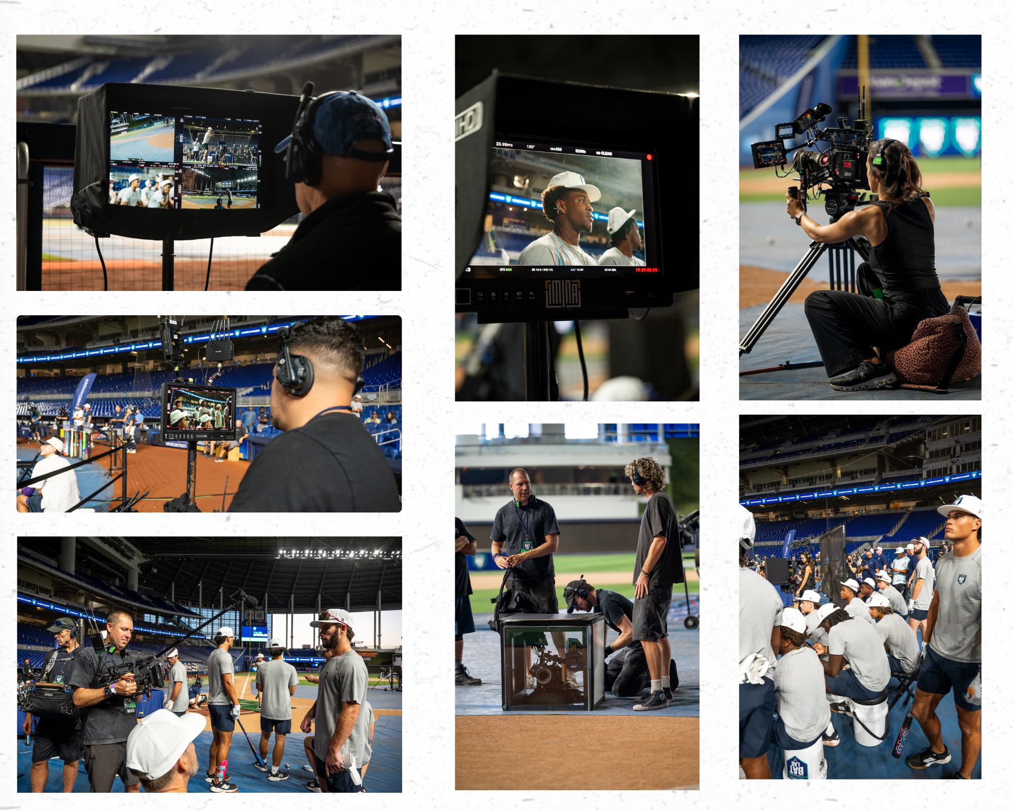 On the production side, we went all in. Six simultaneous camera rigs, each capturing something the others couldn't — a behind-home-plate camera mounted in a custom plexiglass box for the exact moment of contact, a massive long-lens TV rig tracking balls all the way to the fence, slow-mo side profiles for swing breakdowns, a roaming on-field camera for spontaneous interviews and live data reactions, a social camera loose in the dugout for everything unscripted, and an FPV drone operated by Airwolf Drones chasing balls in flight for those sweeping, cinematic arcs over the field. Every angle was intentional. Every cut gives the editor something to work with.